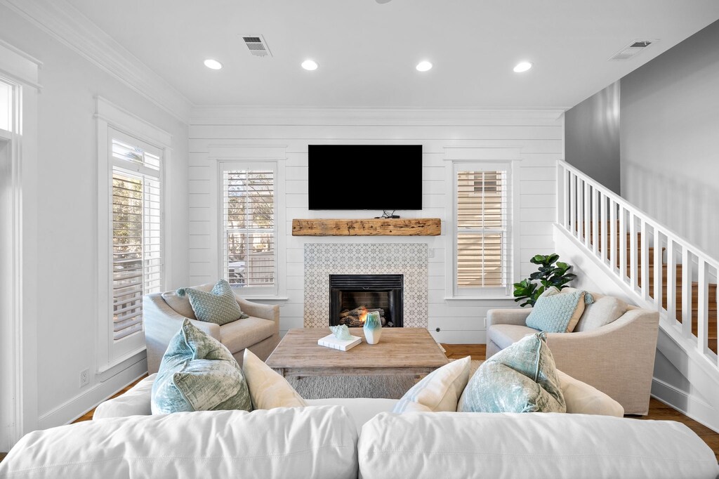 Shiplap walls, splashes of aquamarine, warm woods, and a beachy bead chandelier all add to the refined charm throughout the first-floor great room of this bright, beautiful home. In the living space, 2 matching armchairs and a sofa frame the TV, offering an intimate spot to enjoy movies or relaxed catch-up sessions. Beyond the living space is a dining table for 10, with 4 extra seats at the nearby breakfast bar. The chef of the group will delight in the spacious countertops and high-end appliances in the open kitchen, boasting a glass induction stove and a wine cooler. Out the back door is a propane grill for barbecues. A serene guest bedroom with a king bed, private bathroom, and Smart TV is on this level—early risers will love the private back porch, which leads out to a walking trail. A washer and dryer add convenience for extended stays.