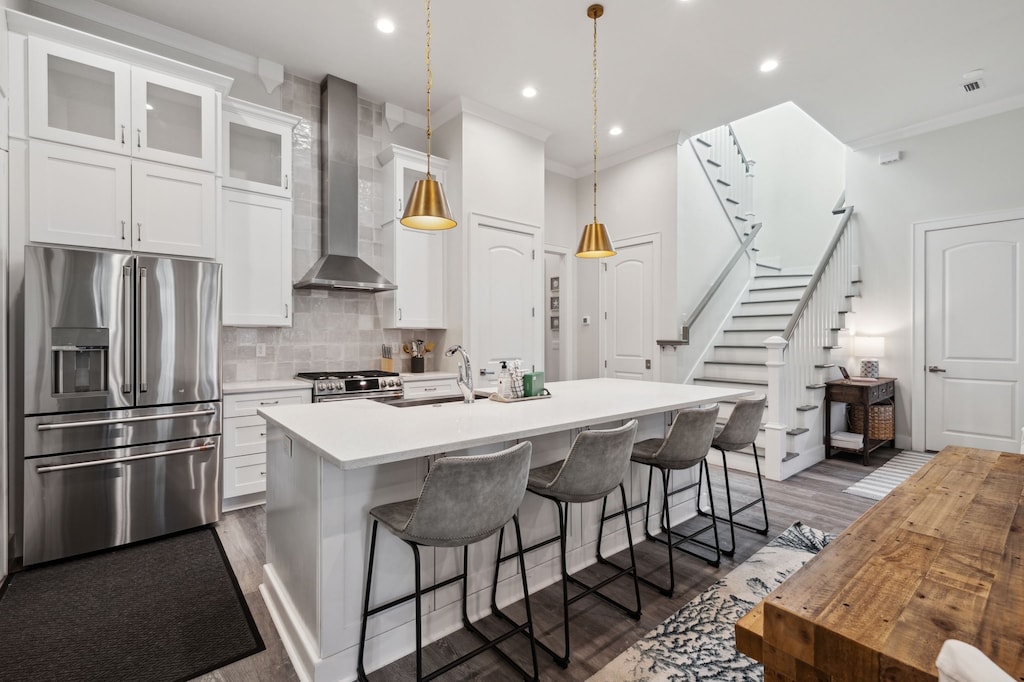The second level hosts additional sleeping accommodations, each with a private bathroom and Smart TV. The first guest bedroom has a king bed and access to the front balcony—enjoy a quiet morning reading on the cushioned patio seating. The second guest bedroom has a queen bed. Young guests or those who don’t mind sharing space can rest in the bunk room with 2 twin-over-twin beds. Additionally, there is a second balcony with sun loungers, a sunny office, and a laundry room.