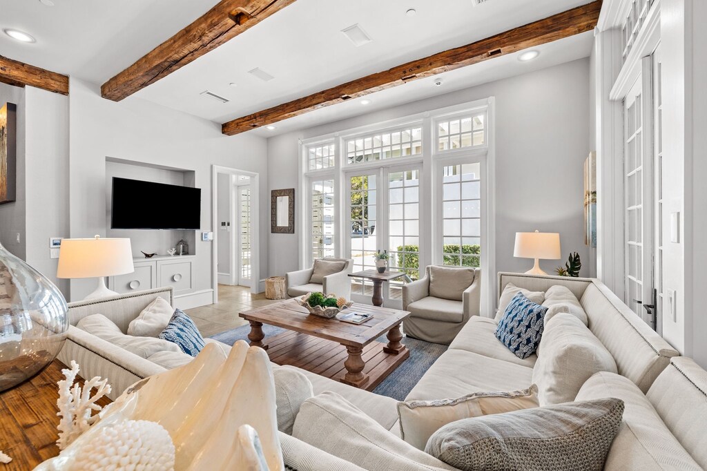 The 3-bedroom, 4.5-bathroom Main House has an open living, dining, and kitchen area with exposed timber ceiling beams, a tile floor, and a refined coastal aesthetic with a SONOS sound system. A white and bright gourmet kitchen has premium appliances, a Thermador 4-burner gas range with a griddle, and gorgeous Calcutta marble countertops that lead to an adjacent butler’s pantry with additional storage. Windows and French doors wrap around the living and dining area, filling the space with natural light. A bedroom is tucked off the living area. Guests can recline on a wraparound sofa and watch TV. Guests will love this private oasis! They can relax in the shade of a covered porch or step down to a landscaped courtyard. A stone walkway connects a dining area to a luxurious outdoor kitchen with a marble counter, a gas grill, 2 gas cooktops, and a stand-alone ice maker.