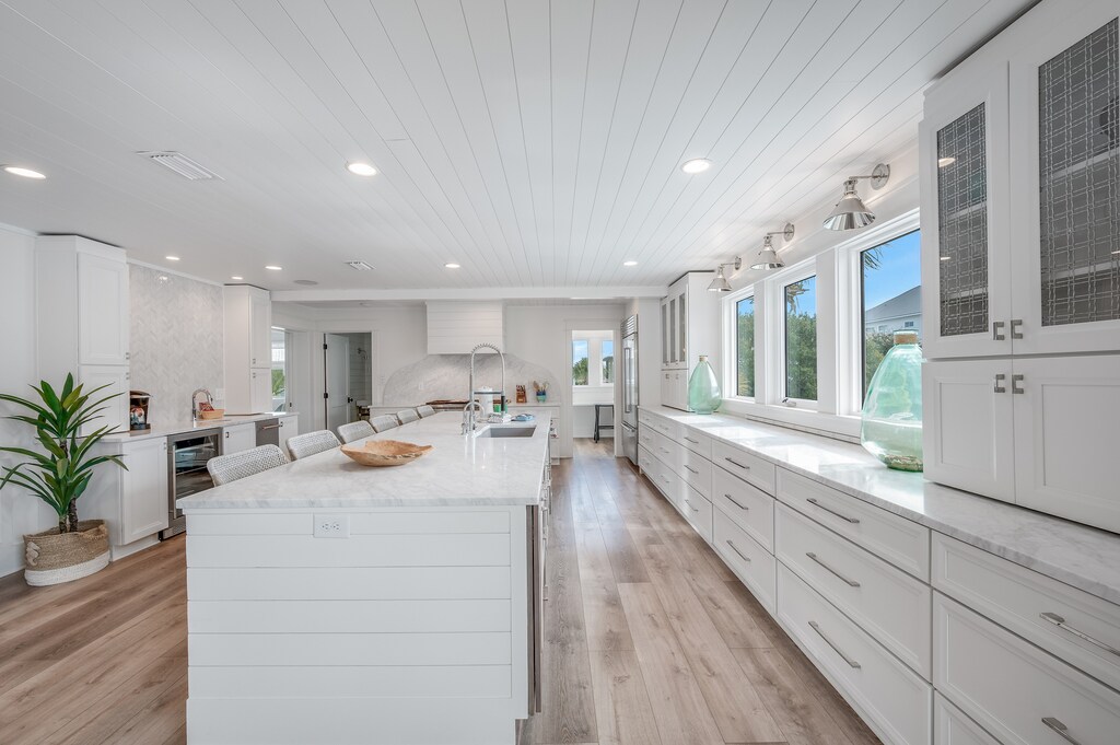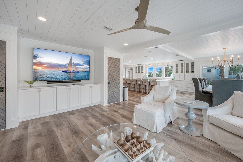 A cozy mini-living room with views of Western Lake welcomes guests to the second floor. It’s a beautiful spot for kids to gather and watch TV while adults gather in an adjacent kitchen and main living area. A huge open-concept kitchen is a chef’s dream! Gleaming marble countertops, premium Wolf appliances, and an eat-in island that seats 6 enjoy light from 3 large windows. A separate coffee/drinks station with a wine fridge and ice maker stands out with glittering chevron tile. The calming white and gray interior and ship-lap ceiling continue into the adjacent dining and living area. Here, guests can enjoy an 85” Smart TV with a SONOS sound system tucked into an alcove but viewed comfortably from 2 comfy slip-covered sofas. Or dine at a dining table that seats 8.
