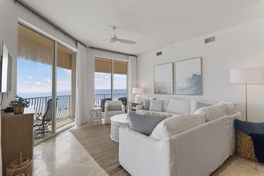 Mesmerizing views of the gleaming Gulf provide a brilliant canvas for this modern coastal condo’s living, dining, and kitchen areas. Sparkling tile floors, beach-inspired accents, and a soft sectional create a stunning living area for guests to gather. The contemporary kitchen is stylishly designed with a waterfall island that seats 2 and high-end appliances, making preparing an evening feast or morning brunch a delightful experience. With 2 benches and 2 chairs, there’s plenty of space for the group to dine at the sleek wood dining table. Multiple glass doors allow guests to move freely onto the oversized balcony to drink in the resplendent view, bask in the gentle breeze, or dine alfresco at the table for 6. Feel free to pack light with the convenient laundry room. As night rolls in, retire to the primary bedroom with a king bed or the 2 guest bedrooms—the first has 2 twins and the second a king bed. All the bedrooms feature private bathrooms and balcony access.