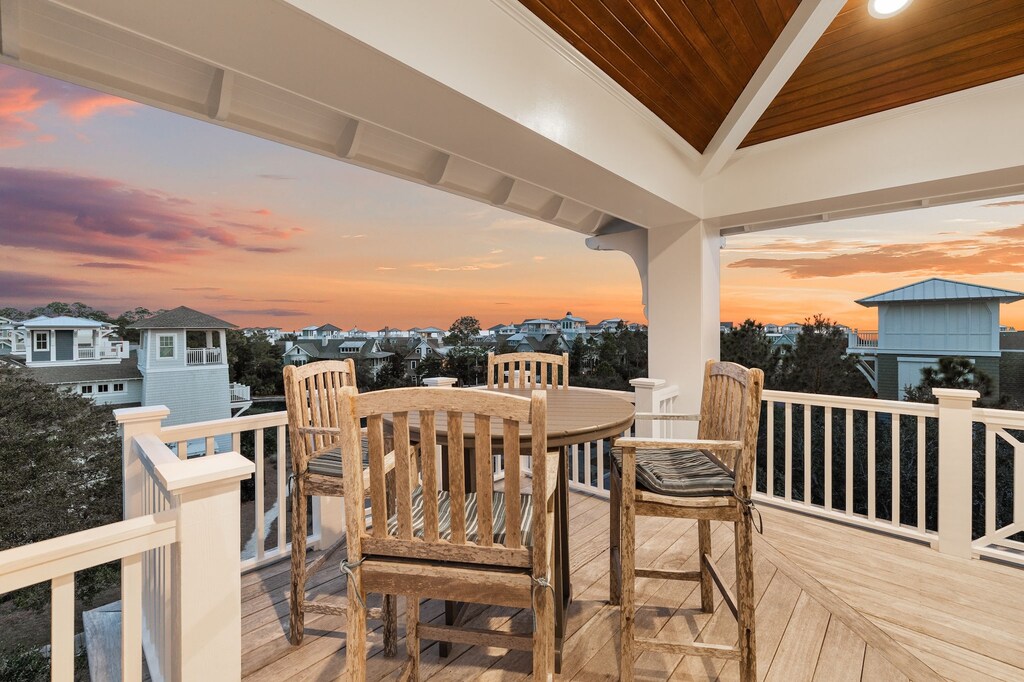 The home’s second primary suite is on the third floor and offers a beautiful king bed, a private en-suite bathroom, and a large balcony. Kids will love the bunk room, which features two twin-over-twin bunk beds, a flat-screen television, and a shared bathroom. Also on this floor is a secondary living room offering a cozy queen sleeper sofa, and a large flat-screen television A spiral staircase leads to the home’s lookout tower, which boasts incredible WaterSound beach and community views.