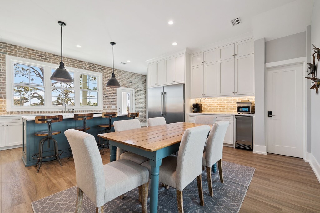 Upstairs, the main floor acts as the heart of this home, where soft blues and sandy beiges come alive under streams of natural light, framed by breathtaking coastal views. Sink into the L-shaped sectional in the cozy living room to plan the day’s itinerary or enjoy a family movie night on the large TV. The kitchen and dining area blend exposed brick, high-end appliances, and ample seating at the 4-stool breakfast bar or 6-chair traditional dining table for the ultimate gathering spot. A small coffee bar adds convenience. Beyond 2 tucked-away hallway washers and dryers, guests can easily retire to the 3 spacious bedrooms. A lovely primary with a king bed, private bathroom, and deck access, alongside 2 versatile guest bedrooms, each with a private bathroom and a king bed that converts into 2 extra-large twin beds—great for families! Step outside to the expansive second-floor deck, where a covered sitting area with plush furniture and a TV invites relaxation. Fire up the Big Green Egg for a flavorful feast, dine around the 6-person table, or take a refreshing swim in the private spa before sunbathing at the beach.