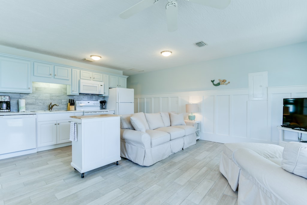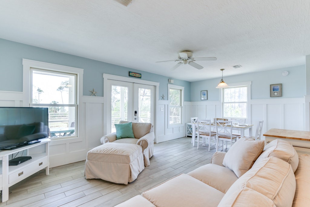 Scallop Cove #1 is a pet-friendly two bedroom cottage on St. Joe’s Bay with deeded beach and bay access, screened in porch, dock, and large yard!