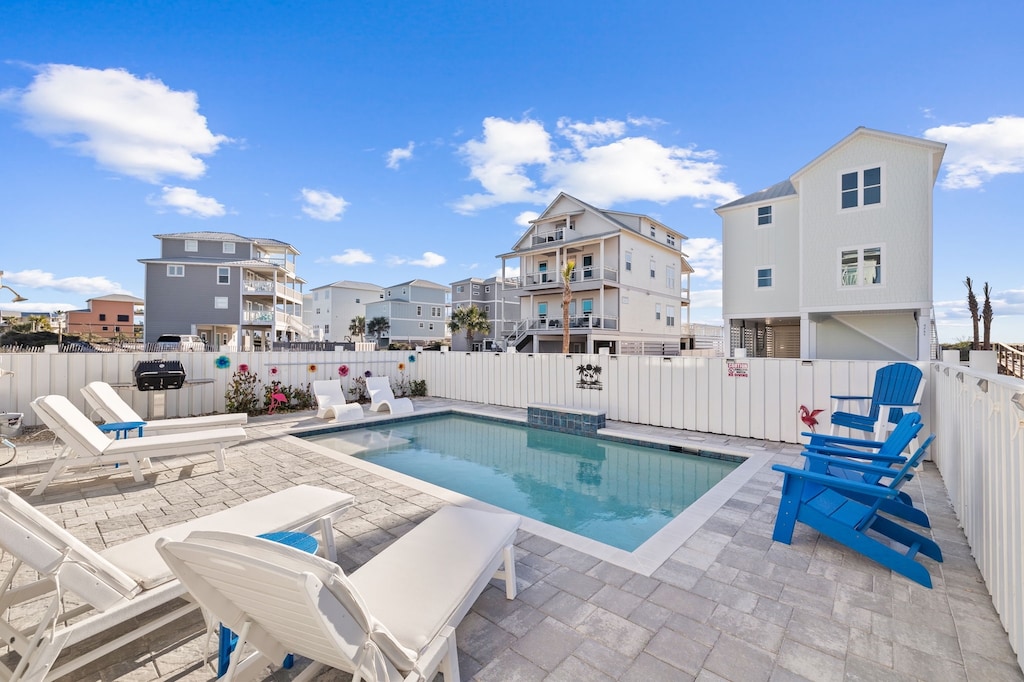 The first floor of this incredible 3-story home has 2 spacious guest bedrooms with queen-sized beds and 43" TVs for entertainment. Step outside and enjoy the ultimate outdoor oasis with a screened-in porch, plenty of seating, a 40" TV, and a giant Connect 4 game. Just off the porch is a private patio with an outdoor shower, BBQ grill, private pool with a waterfall feature, 6 loungers, and fun pool floaties available for guest use.