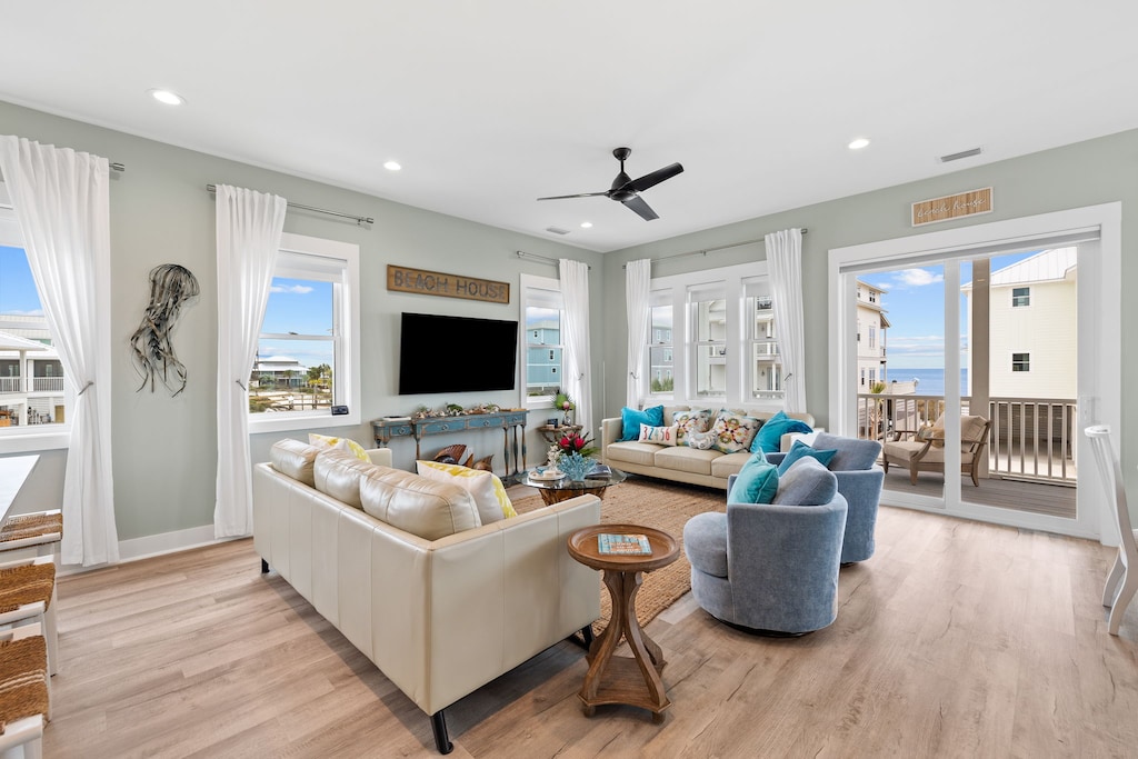 The second floor is the heart of this luxurious home, with a spacious great room that blends style and comfort. Relax in front of the 65" TV situated in front of 2 comfortable couches and blue armchairs—the perfect spot for movie nights. The traditional dining area, encircled by windows, comfortably seats 6. A sleek and modern kitchen features high-end GE appliances, white cabinetry, a vibrant blue backsplash, and an island with a built-in sink that doubles as a 3-stool breakfast bar. There’s even a coffee bar equipped with a Keurig coffee maker and an assortment of K-cups for coffee lovers! From the great room, step out onto the second-floor covered deck with plush outdoor furniture, an alfresco dining table for 6, and views of the Gulf. When it’s time to recharge, escape to a lovely primary bedroom with a king-sized bed and 50" TV before stepping out onto the small private deck with Gulf views.