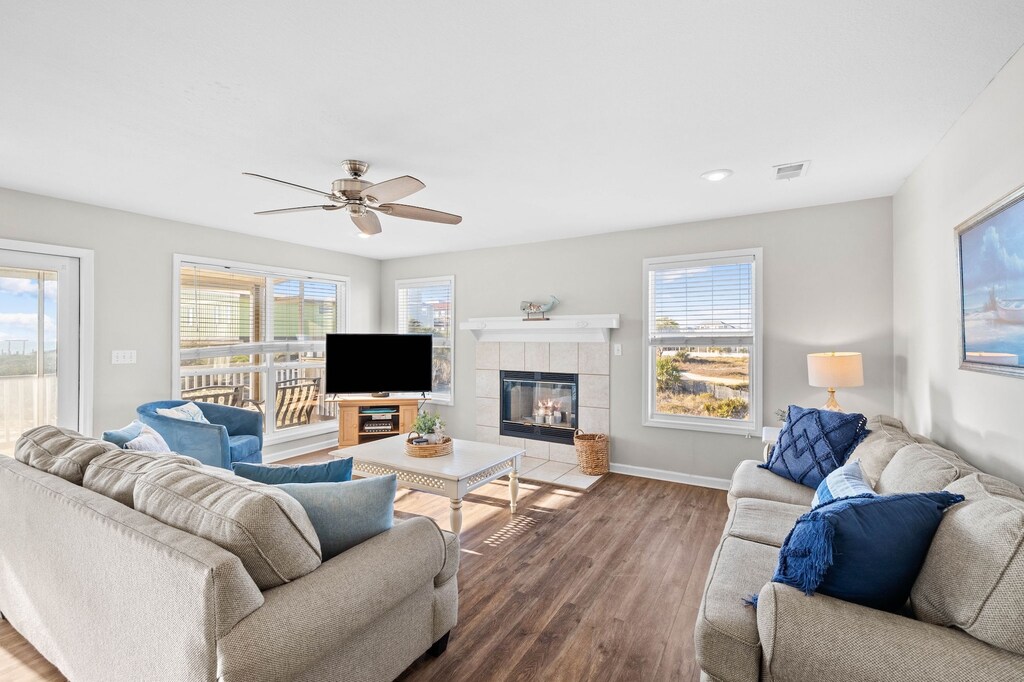 A spacious great room filled with natural light and cozy furnishings awaits on the main level. The open kitchen features high-end appliances and a 3-seat breakfast bar steps away from the 6-seat dining table, where guests can converge for delicious meals or plan the day’s adventures. In the living space, 2 soft sofas and a barrel armchair flank the TV, offering plenty of room for movie nights with the group. Head outside to the furnished screened-in deck to enjoy views of the water and the fresh ocean air. For convenience, a laundry room can be found on this level, alongside a queen sleeper sofa in the living space.