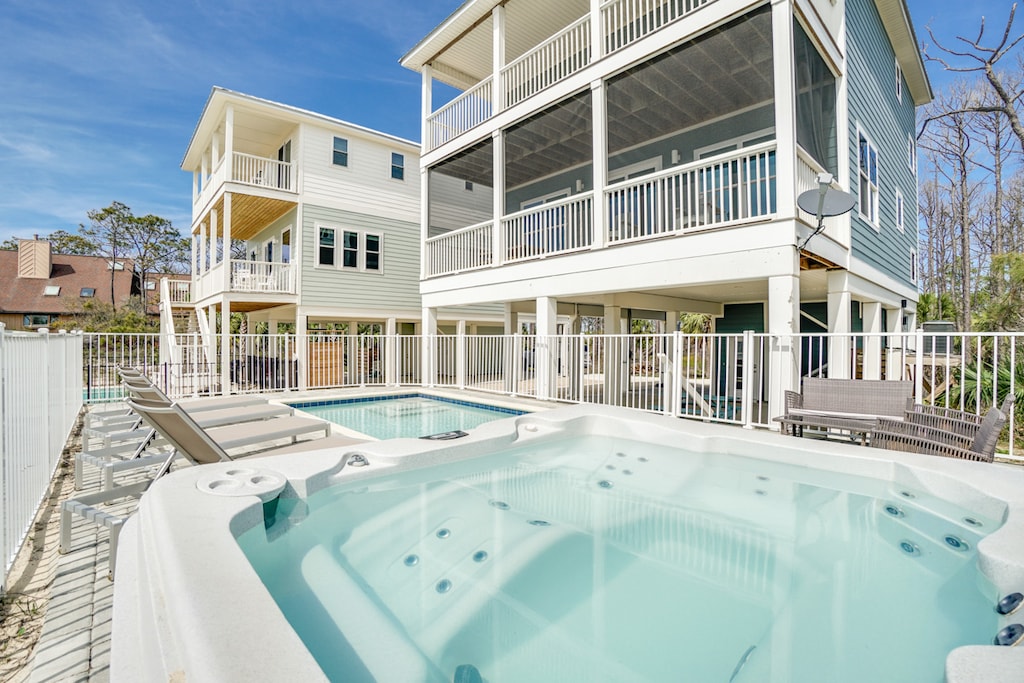In the carport area, underneath this stilted home, is a gas grill, picnic table, and access to a large private pool and hot tub. Guests can admire the beach views while lounging poolside or unwind in the hot tub after a busy day of jumping the waves. A wooden boardwalk leads directly to the beach!