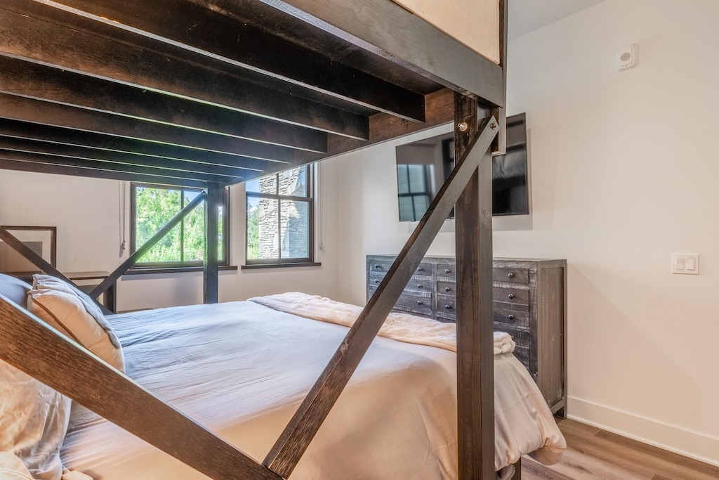 - Guest Bedroom: Queen-over-King Bunk Bed, Shared Bathroom with Shower/Tub Combo