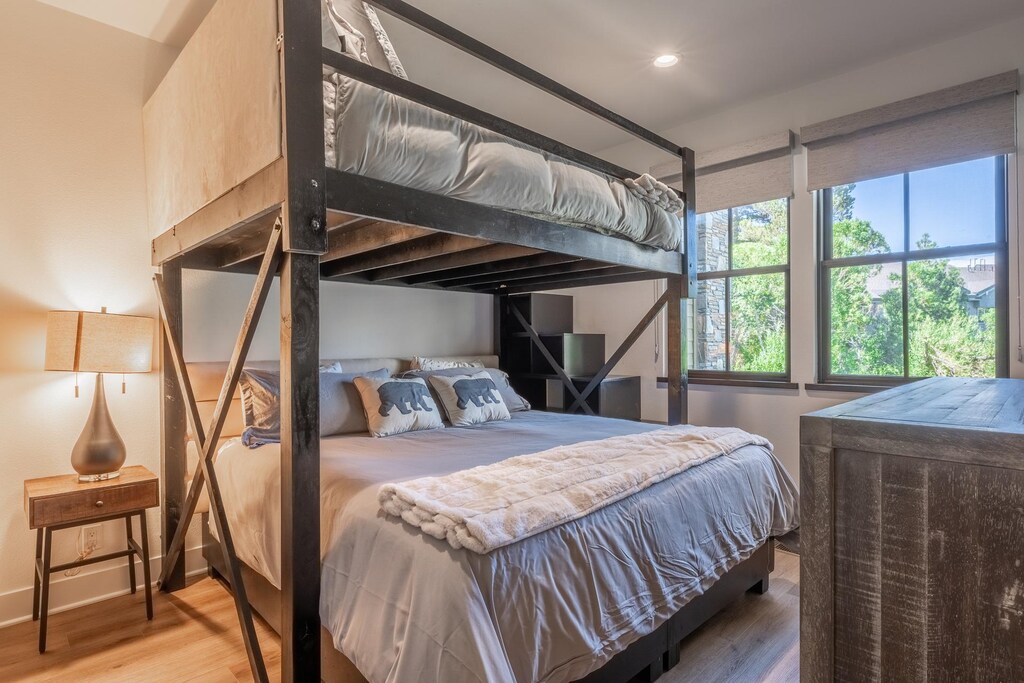 Experience ultimate comfort on the first floor of this stunning 2-story townhome. Step into the beautifully designed bunk room, complete with a queen-over-king bed and a TV for entertainment. Another equally inviting guest bedroom awaits, featuring a full bed, TV, and access to a covered balcony adorned with elegant stonework. Relax in style in the charming seating area while taking in the breathtaking mountain views. There’s a laundry room to keep clothes and ski gear fresh.