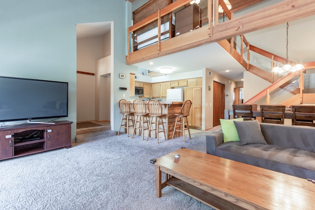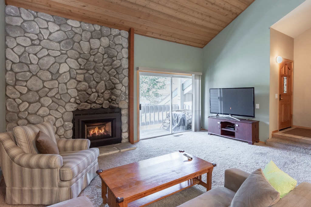 This lovely condo opens into an inviting, 2-story living area with hardwood beams, plush carpet, and a charming fireplace set against a beautiful river rock wall. A comfortable modern sofa and armchair invite gatherings by the flickering fire, while the TV and DVD player are perfect for nights of popcorn and movies. Behind the sofa, a hardwood table comfortably seats up to 8 guests, with additional seating for 4 at the kitchen breakfast bar. An open floor plan creates a seamless flow between the living space, dining area, and fully equipped kitchen. For barbecue lovers, there is a grill on the balcony off the living space. Continue past the convenient washer and dryer to find the primary bedroom with a king bed, private bathroom, and Smart TV, alongside a guest bedroom with a queen bed.