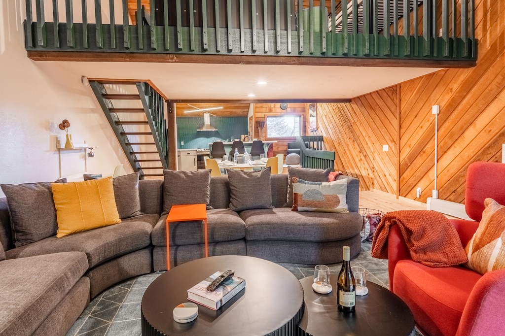 Upstairs, discover the great room on the main level. After a day conquering the slopes, pile onto the plush sectional and warm up in front of the fireplace while streaming a favorite movie on the Smart TV. Whip up dinner in the colorful, open kitchen, equipped with top-end appliances, and eat at the 6-person dining table. There’s seating for 3 more at the breakfast bar. A cozy armchair to the side offers a quiet spot to curl up with a cup of coffee, or take a mug out on the balcony where there’s a dining set for 2 and a grill.
