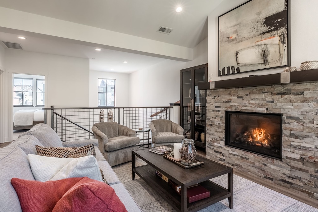 On the main level, an open living, dining, and kitchen space offers room to gather. A beamed cathedral ceiling, hardwood floors, and a stacked stone fireplace add rustic mountain charm while melding with the modern touches and furnishings throughout the space. Enjoy a cozy evening piled on the sofa and armchairs in the living area, watching movies on the Smart TV, or visiting with friends as the fireplace flickers. The kitchen is fully equipped with high-end appliances and a roomy 3-seat breakfast bar—perfect for catching up with a glass of wine as dinner simmers in the background. An adjacent dining table seats 6 and enjoys mountain views through sliding glass doors that open to a wide covered balcony with a grill and seating. Sip a nightcap and enjoy the surrounding nature views, including glimpses of the mountain peaks! When bedtime arrives, the primary bedroom is found on this level boasting a plush king bed, TV, and private bathroom.