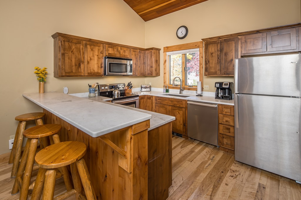 An enclosed entryway welcomes guests into this marvelous mountain condo. Shuck off boots and hang coats on the conveniently provided hooks before heading into the first-floor great room. The well-equipped kitchen features high-end appliances and a 3-stool breakfast bar perfect for chatting with guests while the chef of the group prepares a meal to recharge after a day of adventure. For formal dining, there is a contemporary wood table with 5 chairs and a bench between the kitchen and living space. When the day is done, the cozy living area invites guests to recline in the leather armchair and sofa for an evening of movies or catching up by the charming stone fireplace. A door on the back wall leads to a spacious balcony furnished with 2 chairs overlooking the evergreen-dotted landscape and nearby Lake Levinsky. A cheery bunk room with a log-style twin-over-queen bed is on this level.