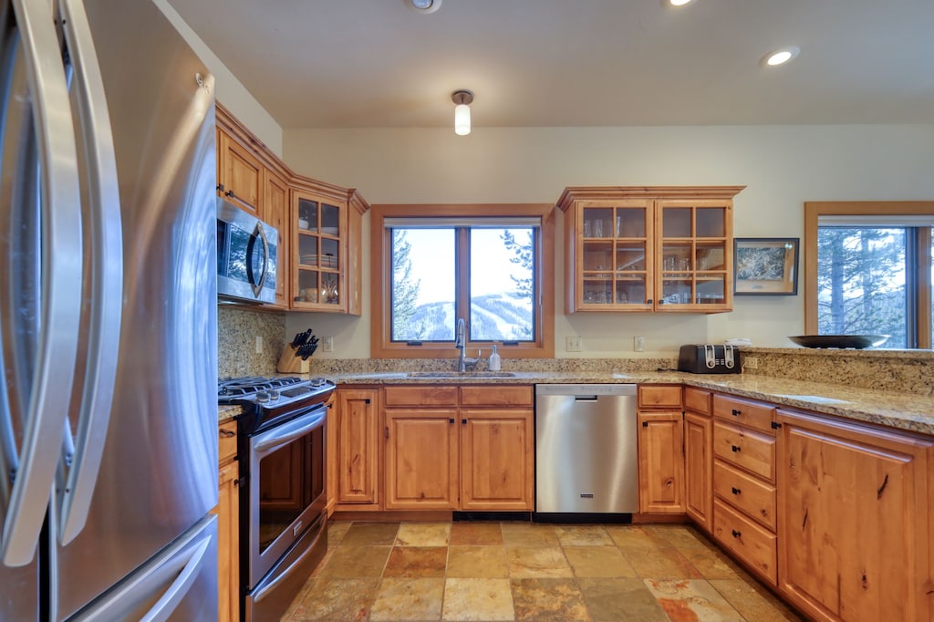 Sunlight beams through the soaring picture windows, highlighting the cathedral ceiling and exposed log trusses in the main level great room as guests enter. After a day of exploring the mountain, sink into the leather sofas in front of the stacked-stone fireplace and warm up by the flickering flames. Cooking is a delightful venture with high-end appliances, stone tile floors, and a picturesque view in the kitchen. Cubbies and hooks in the adjacent laundry room offer convenient storage for Winter gear. The traditional wood dining table seats 8, with 3 more seats at the bar. Out the sliding glass door, find a grill and revel in a tranquil soak in the private hot tub overlooking the snow-capped mountain. When it’s time to retire for the night, the primary bedroom is on this floor and has a king bed, private bathroom, and balcony access.