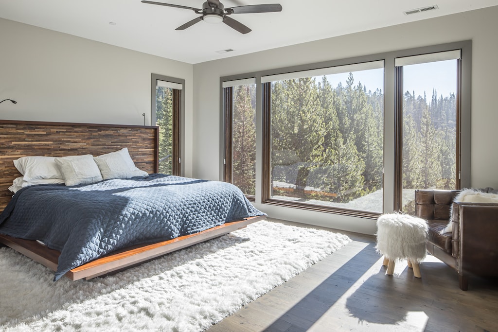 The entrance to this 3-story home reveals a modern mountain aesthetic, marked by a delightful mix of natural colors and textures. The living area, beautifully centered around a wood-burning fireplace, showcases high-end furnishings, tall ceilings, and walls of floor-to-ceiling windows that frame uninterrupted views of the Gallatin Range, Andesite Mountain, and the iconic Lone Peak. Equipped with premium Thermador appliances, the sleek chef’s kitchen is perfect for preparing everything from a hearty breakfast before hitting the slopes to a special dinner crafted by a private chef. A gas grill with Adirondack seating is conveniently located on the side deck for grilling out. Snowcapped mountains and dense forests provide a scenic backdrop while eating at the distinctive blue resin dining table that seats 8, with 4 more seats at the breakfast bar. Outdoor enthusiasts will appreciate the large mud/ski room with benches and hooks to hang wet ski or fishing gear and a home weather station to track fresh powder. A gorgeous primary bedroom on this floor provides a royal sanctuary with a room-sized shower in the private bath.