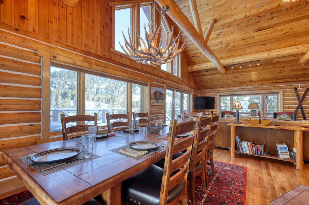 DETAILS: Escape to the mountainside at Big Sky’s Low Dog Lodge! Sleeping up to 12 guests, this 5-bedroom, 3-bathroom log cabin home is a picturesque retreat with ski-in/ski-out access—only minutes from dining and shopping at Big Sky Resort’s Mountain Village. Imagine cozy nights lounging by the wood-burning fireplace, soaking in the hot tub surrounded by towering evergreens, or sipping cocktails on the upper deck and watching the wildlife.