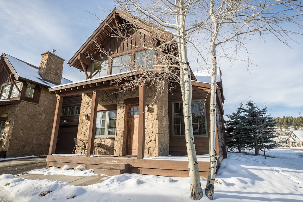 Nestled on a quiet street with a covered front porch overlooking the mountains, this spacious townhouse welcomes guests to an open-concept living area with high ceilings, big picture windows, and alpine chalet decor—including vintage skis and log furniture. In the sitting area, a wraparound leather sofa and 2 country armchairs frame a soaring stone fireplace and TV for cozy nights inside after a day on the mountain. Steps away, high-end appliances and a gas range in the kitchen make it simple to prepare a delicious meal for 4 to share in the light-filled dining area, with 3 extra spots at the bar. Feel free to pack light and take advantage of the convenient laundry room. As the day ends, the primary bedroom with a king bed provides a tranquil spot for rest.