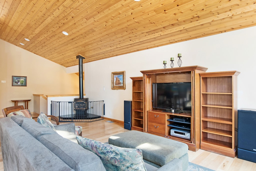 On the main level, a golden tongue-and-groove wood ceiling stretches above the open great room, accented by sunlight from the picture and clerestory windows. In the corner, a gas stove fireplace offers warmth on snowy Winter nights. The kitchen features Kenmore appliances and a breakfast bar for entertaining friends or prepping meals while keeping an eye on little ones. Up to 8 can share meals at the dining table, and in the Summer months guests can dine alfresco at the balcony table for 4. When it’s time to unwind, slip outside to relax in the patio hot tub or settle into the living area’s soft couch and chaise armchair to watch a movie on the Roku TV. The primary bedroom is on this floor and boasts a king bed, private bathroom, TV, and a private balcony.