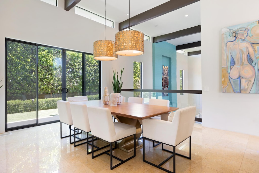 The lower level is a double-height great room with a soaring gas fireplace, and modern sofas, offering plenty of room for entertaining. A covered outdoor dining table and fountain offer a beautiful location for a romantic meal.