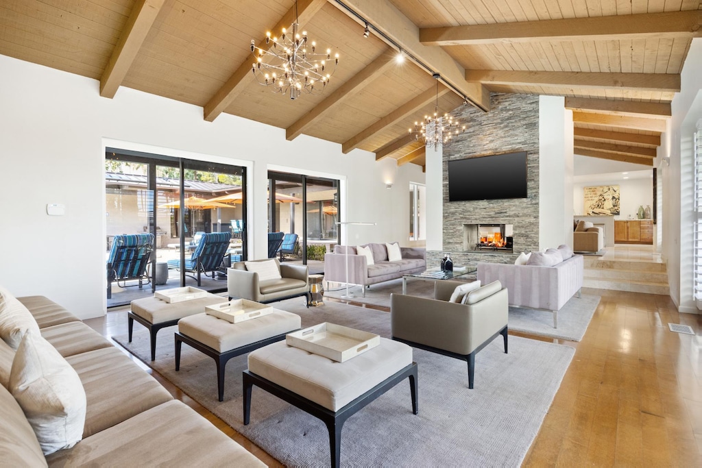 The primary suite features a custom California king-sized bed, with large sliding glass doors facing the pool to the east. Its en suite bath is a true spa experience, with a free-standing jetted tub, stacked stone fireplace, and separate water closet with bidet. A sliding glass door opens onto a semi-private patio with western facing mountain views. The remaining bedrooms are located off the main entrance and offer 40” HD Flat Screen TVs, each with en suite baths.