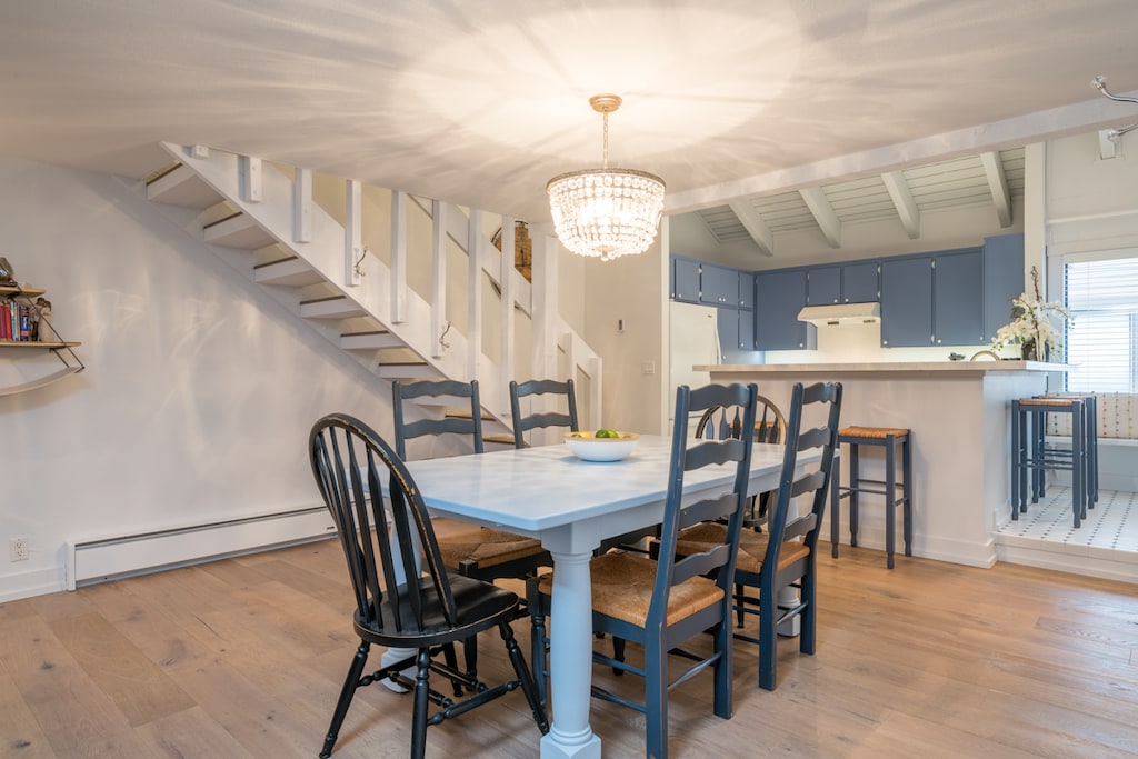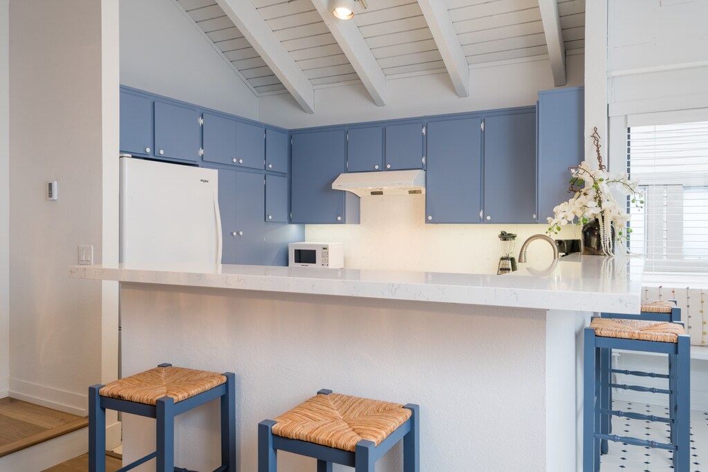 Take the stairs to the main floor, where a white cathedral ceiling, shiplap walls, and comfy furniture create a charming cottage atmosphere. The back half of the great room encompasses the dining table for 6 and the fully equipped open kitchen with a 4-stool breakfast bar. Guests who need to mix a bit of work with leisure can use the sunny desk area by the window seat. In the living area, a soft sofa and armchair invite guests to curl up for a night watching the Smart TV or warming up by the fire. On Summer evenings, venture onto the spacious deck to dine alfresco at the 4-seat patio table, enjoy a nightcap, or search the starry Idaho sky for constellations.