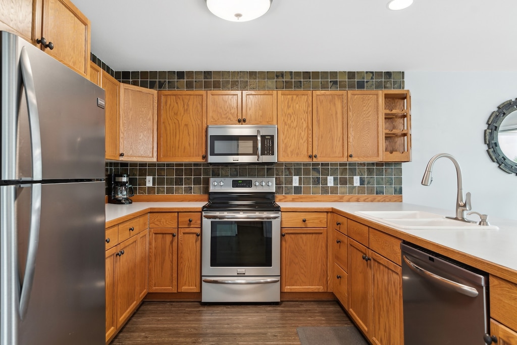 Step into the heart of this captivating 2-story townhome, where every corner beckons guests to relax, and every window frames golf course views. Embrace the open, airy ambiance in the serene great room, complemented by brilliant natural light that cascades into the space. Spend time with loved ones in the welcoming living area, anchored by a rustic gas fireplace crafted from stacked stones and a large Smart TV perfectly poised for entertainment. The room’s centerpiece is a plush sectional that promises comfort and transforms effortlessly into a king sleeper sofa for 2. Culinary enthusiasts will delight in the open kitchen being fully stocked with all the little necessitates and premium appliances needed to whip up a delicious meal. Chat and prep at the charming breakfast bar, which seats 3, or gather for a family dinner in the dining area that comfortably accommodates 6. Outdoor entertaining is a breeze with a convenient gas grill and alfresco dining table on the back deck off the dining area. Unwind in the private hot tub while admiring the views of the lush 13th fairway. An easily accessible guest bedroom on the main level boasts a king bed and Smart TV. There’s also a laundry room for extended stays.