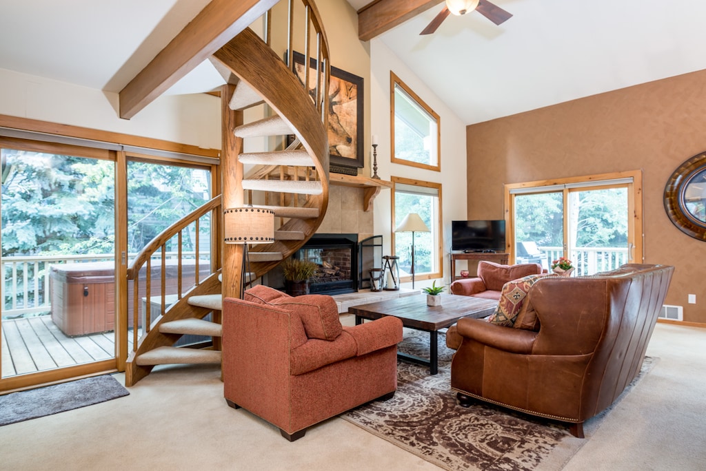 Ascend the spiral staircase from the great room to discover a spacious second-floor loft boasting a TV, comfy sofa, and armchair perfect for unwinding!