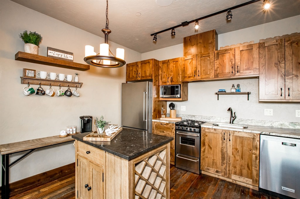 This lovely penthouse suite has everything guests need! Guests enter an open dining and living area with hardwood floors and an interior inspired by Montana’s beauty. Two sets of sliding glass doors provide natural light and mountain views to the space. In the living area, a queen sleeper sofa and armchairs surround a large TV. Opposite the living area is a guest bedroom with a king bed and access to a shared bathroom with a shower/tub combo. A short flight of stairs leads off the living area to the primary bedroom. Guests staying in this bedroom will enjoy a king bed and a private bathroom with a stacked washer and dryer. A beautiful stone-topped dining table that seats 4 divides the kitchen from the living area. Guests can enjoy mountain views while they eat or while they prepare a meal. Granite countertops, a gas range, and a center island provide plenty of space in the kitchen. Stepping out of the sliding glass doors, guests will discover a large balcony with incredible views. A gas grill, a gas fire table, string lights, and cushioned chairs create an inviting space to curl up and chat as the sun begins to set.