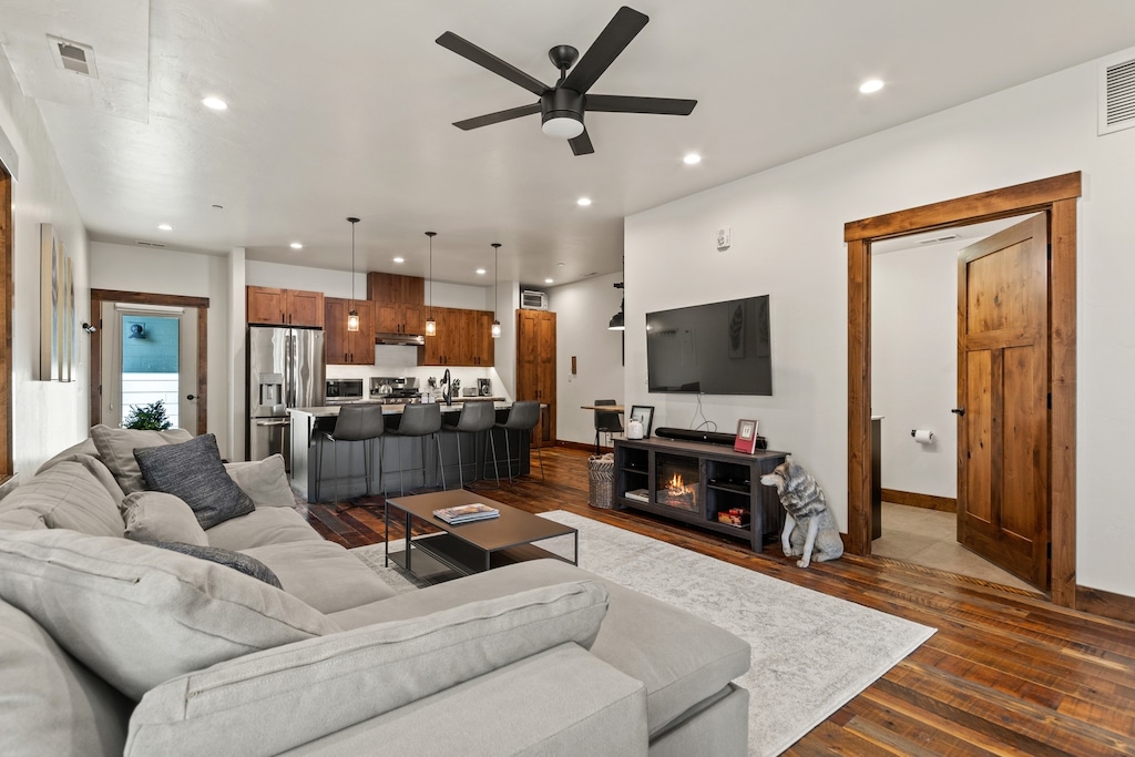Entering from the second floor, guests are greeted by dark wood floors and relaxing Earth tones. The two cozy, king bedrooms share the bathroom with the open common area. The plush couch and bar seating for 4 provides a friendly space to enjoy a meal or plan the day’s adventure. The condo’s balcony is perfect for enjoying a cup of coffee and fresh mountain air or grilling out on a Summer night.