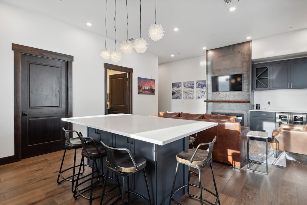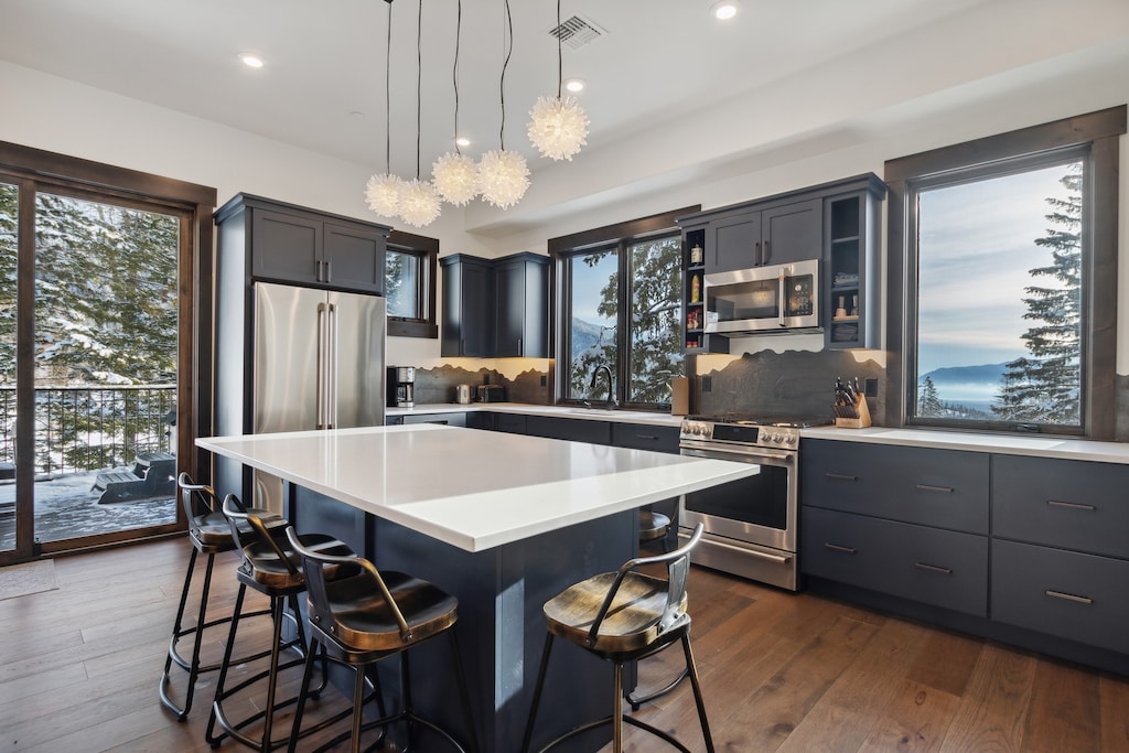 Upon entry, guests will find a bench, cubbies, and hooks for storing cold-weather gear. Continue into the kitchen and living area, where a gas fireplace burns. There’s space for the whole group to gather around the island, with seating for 8. The well-equipped kitchen includes upgraded appliances and a large walk-in pantry for snacks and groceries. In the living area, get comfortable on the couch or recline in the armchair and watch TV as the fireplace flickers. Outside, barbecue on the Weber grill, soothe sore muscles with a soak in the private hot tub, or sip a nightcap at the outdoor table—all while surrounded by breathtaking mountain views. Retire to the primary bedroom, which features a king bed, gas fireplace, and a cozy reading nook lit with twinkle lights. For additional accommodations, 2 guest bedrooms connect via a Jack-and-Jill bathroom—1 has a king bed while the other is ideal for families with a king bed and a twin-over-twin bunk bed! A washer and dryer are in the hall closet.