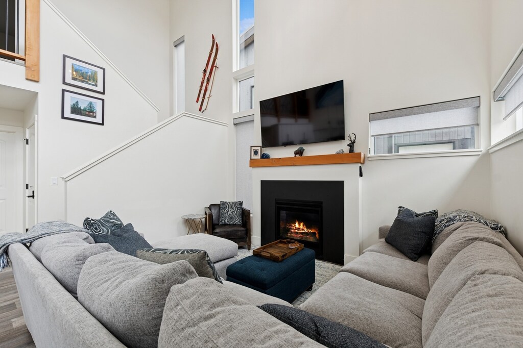 You’ll find an inviting living room with a large flat-screen TV, fireplace, and a cozy sectional sofa. The adjacent kitchen has stainless steel appliances, stunning quartz countertops, and all the pots, pans, dishes, utensils, and counter top appliances you will need to enjoy home cooked meals. There is a half bath on