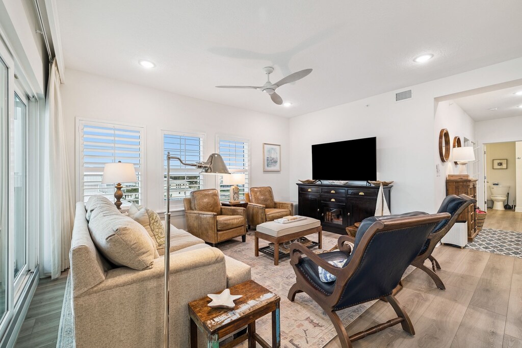 Bright and filled with natural light, this single-story corner unit impeccably combines modern comfort with coastal charm. The kitchen has everything needed to inspire inner chefs, including high-end Café appliances, spacious countertops, and a 5-stool breakfast bar—plan the day over coffee and crepes! For formal meals, the wooden dining table, accented with wicker-style seating, accommodates 6-8 guests. End the night relaxing around the Smart TV in the living space, beautifully adorned with a sofa, 2 sets of leather armchairs, and sea-inspired décor. Through the sliding glass doors, a large, covered balcony overlooks the Gulf. Grab a drink, sit back, and appreciate the beautiful pastel sunset. When it’s time to turn in for the night, choose between 3 lovely bedrooms. The primary bedroom features a king bed, TV, Peloton bike, and a private bathroom, while the 2 guest bedrooms each have a soft queen bed. A washer and dryer in the hall closet offer convenience for extended stays.