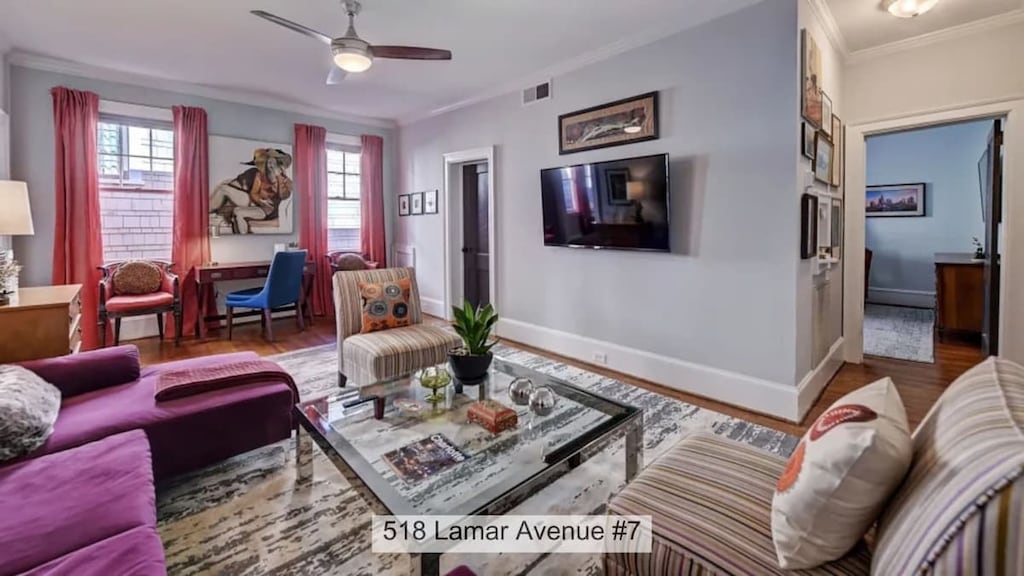Perched on the second floor of a lovingly restored 1920s building, this spacious condo combines timeless architecture with bold, retro-modern design and curated local art.