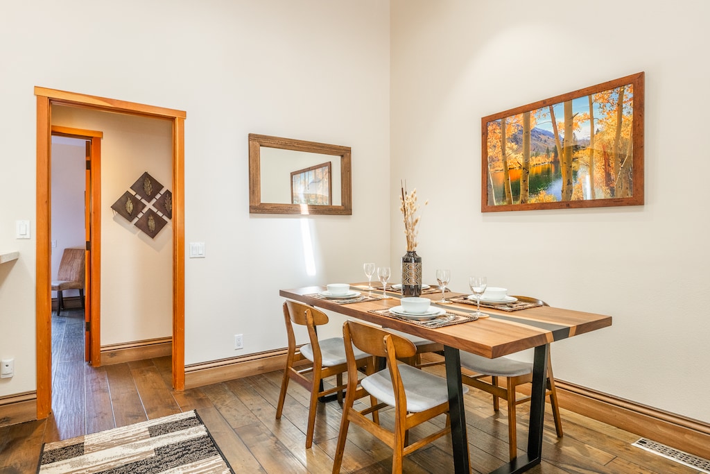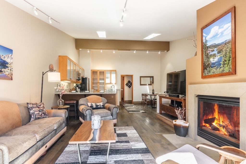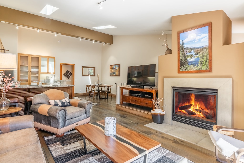 Designed for comfort and elevated mountain living, this townhome features a spacious open-plan great room with vaulted ceilings, an electric fireplace, and oversized windows that bring in natural light throughout the day. The updated kitchen includes stainless steel appliances, solid-surface counters, bar seating, and a dedicated dining area for relaxed meals at home.