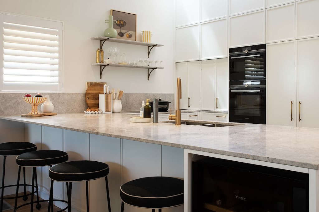 The kitchen delivers refined luxury with its raw marble waterfall benchtop, bespoke cabinetry, and gold fixtures. A Hydro Zip tap dispenses sparkling, still, and hot water on demand. Premium appliances include combi steam and pyro-clean oven, induction cooktop with downdraft ventilation, and two dishwashers. A round timber dining table seats eight beneath sculptural pendant lighting, while the kitchen flows through to the living area to the outdoor entertaining through bifold doors.