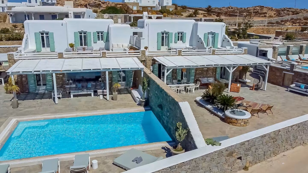 One of the main characteristics of this villa is that all bedrooms have en-suite shower rooms with separate toilets which gives an extra privacy.The villa was designed by a famous Greek architect who combined the local Cycladic architecture with the modern design. The villa can accommodate 11 people. There is a parking space for 3 cars.