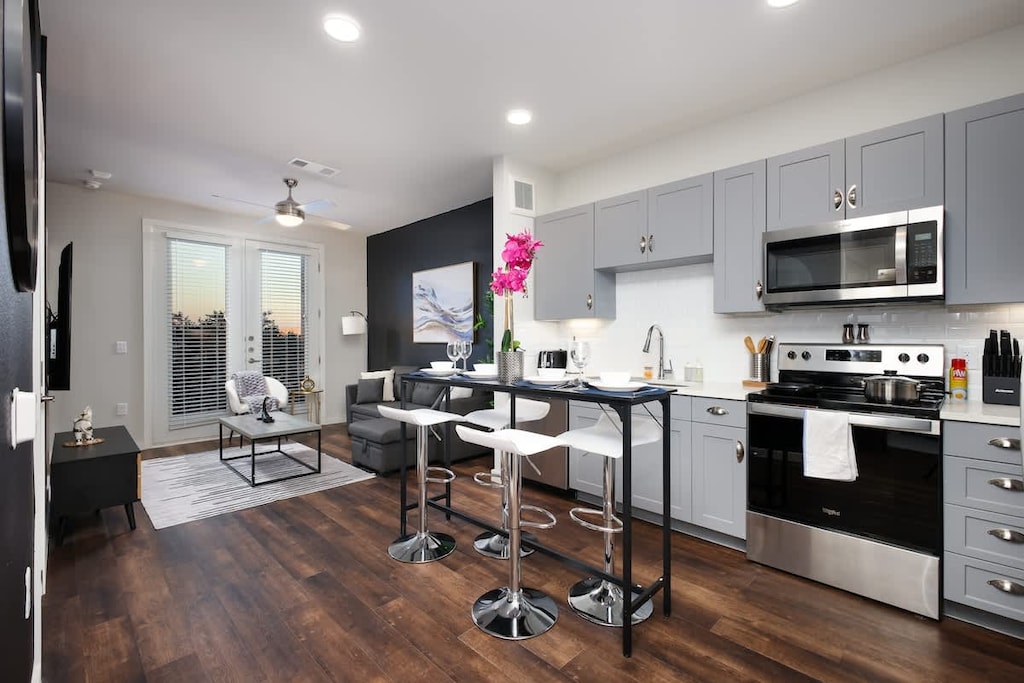 ► KITCHEN: GE stainless steel appliances, Keurig coffee machine, pots, pans, and dining essentials