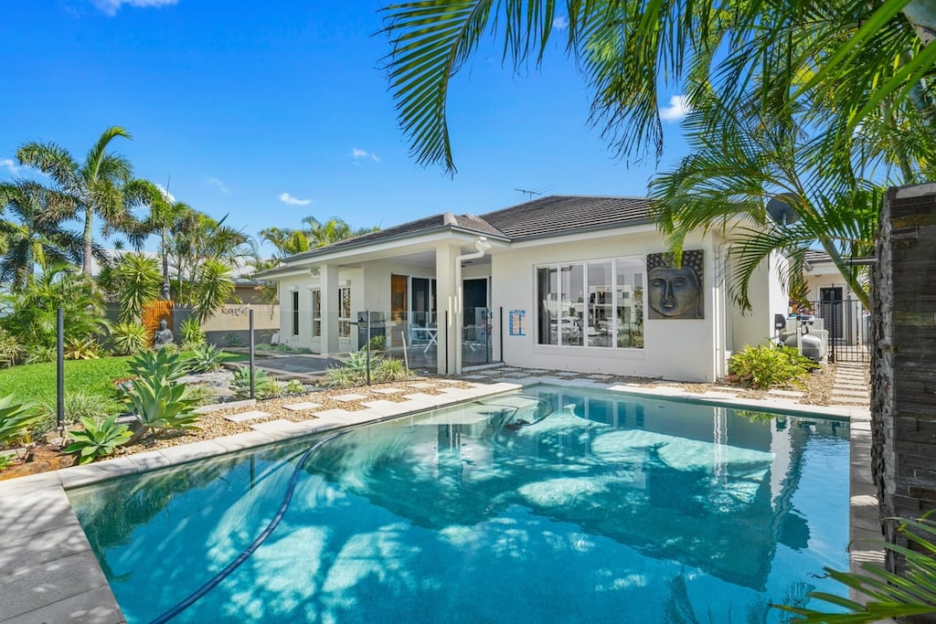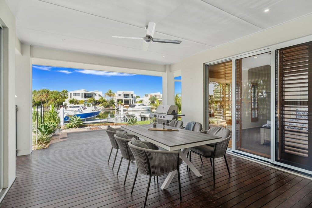 Large bi-fold doors open the home to an inviting outdoor entertaining area, where the shimmering in-ground swimming pool takes centre stage. Alfresco dining is effortless, with a generous outdoor setting and BBQ area ideal for relaxed meals and sunset drinks. From the backyard, step onto your private pontoon — perfect for fishing, kayaking, or mooring the boat for your next water adventure.