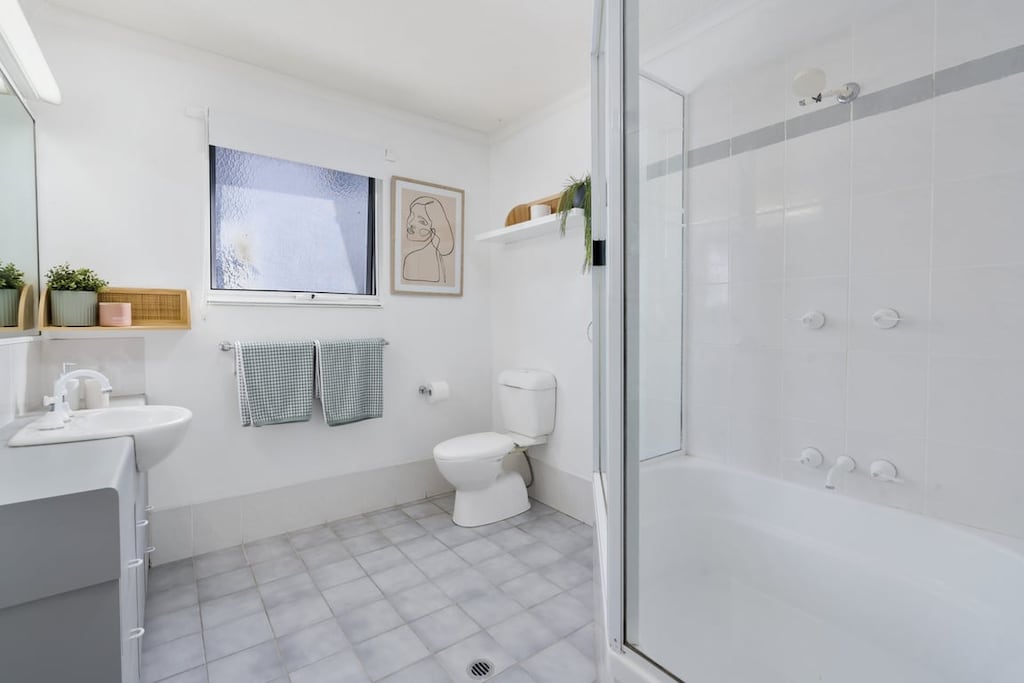 Inside, the spacious two-storey layout is designed for both relaxation and family comfort. On the lower level you’ll find two private queen bedrooms, one with its own ensuite. Upstairs, an open converted bedroom provides a fun and practical kids’ retreat with two single beds plus trundles, comfortably sleeping four. Games, books, and crafts are ready to keep younger guests entertained on quiet afternoons.