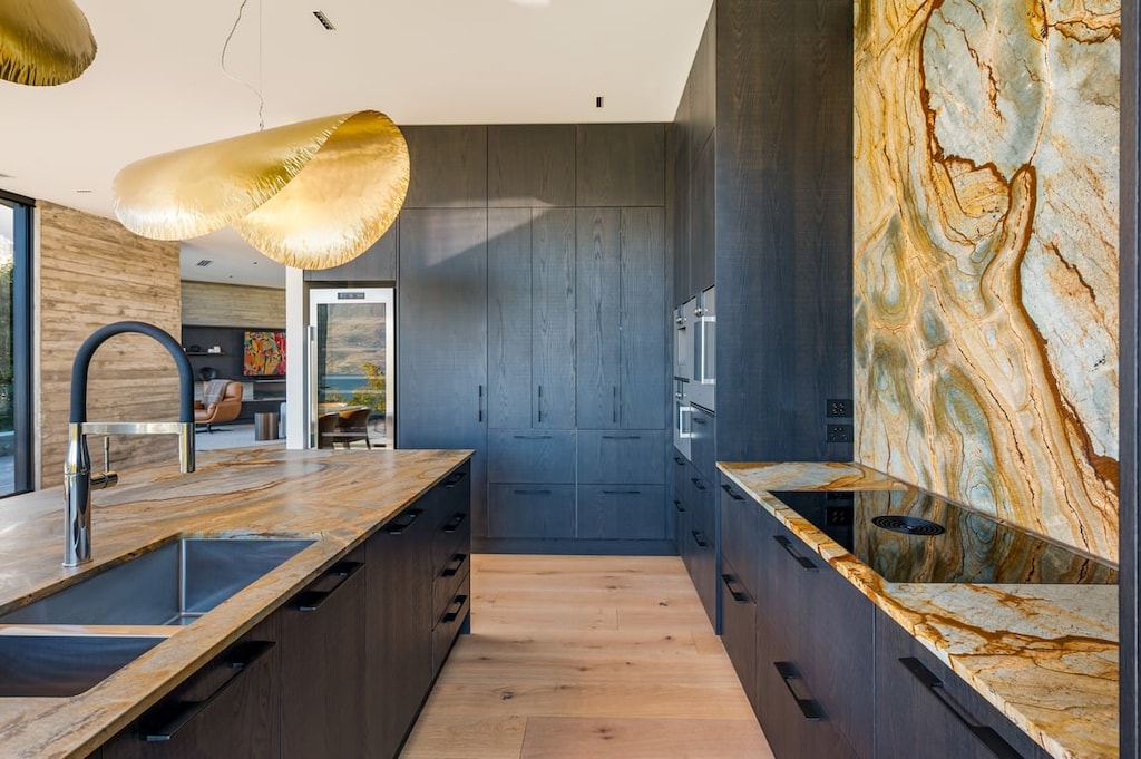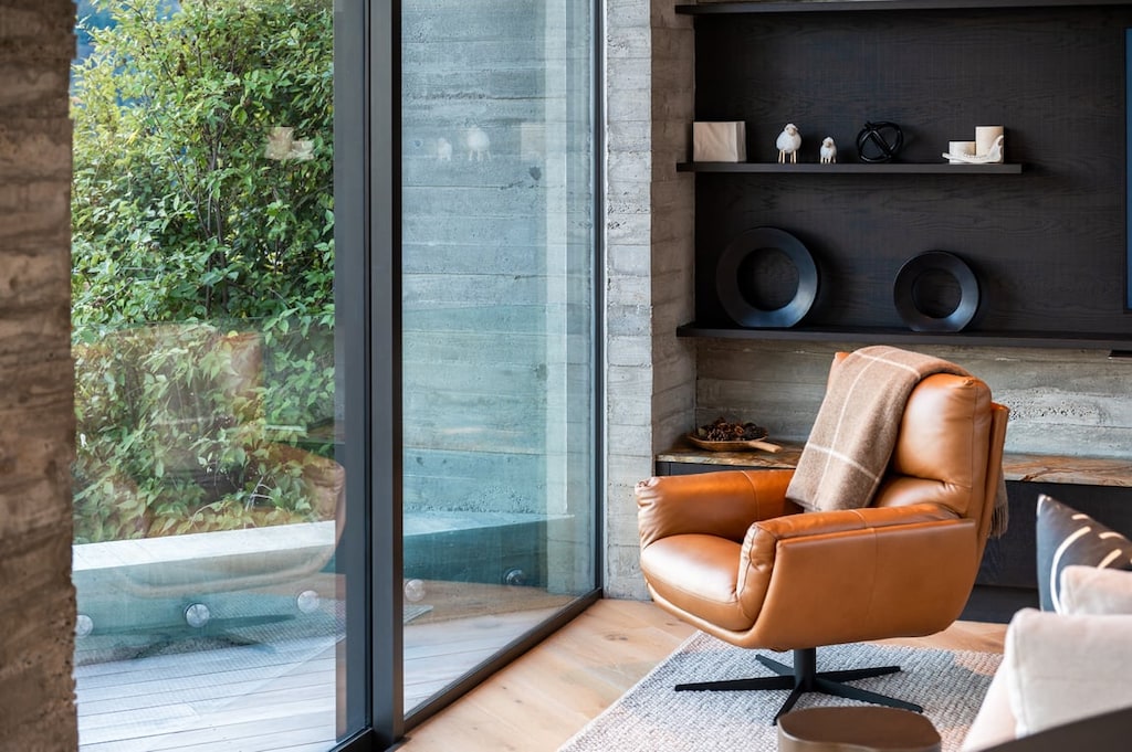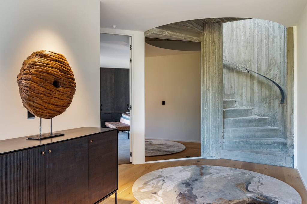 Step inside to experience the light-filled open-plan living area that seamlessly integrates modern design with functional living. The expansive views are a constant reminder of the remarkable natural beauty that surrounds this home, with large windows ensuring that the picturesque landscape is always on display. The interior boasts high ceilings and sleek finishes, accentuated by a dramatic spiral staircase that serves as a stunning focal point, leading you to the upper levels.
