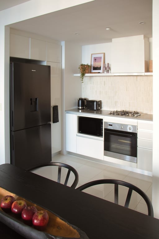 The open-plan living area is perfect for relaxation or entertainment, featuring a comfortable lounge set and flat-screen TV. The fully equipped kitchen comes complete with all necessary appliances including a dishwasher and coffee maker, making it ideal for preparing delicious meals during your stay.