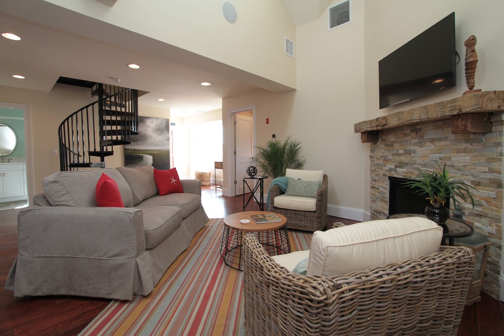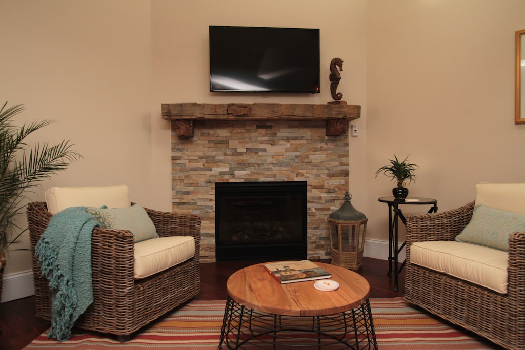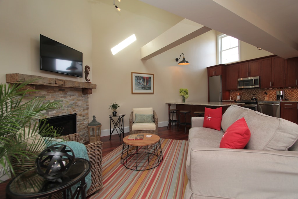 This Loft features an open floor plan anchored by a living area with a cozy fireplace. Adjacent to the living area are the kitchen and a spiral staircase leading to a lofted area with a queen size sofa bed. The Loft’s two bedrooms are on either side of the living area and feature queen size beds and en-suite bathrooms. The outdoor deck is the perfect place to sit outside and enjoy the sunshine. Please note - exterior stairs are required to access the loft.