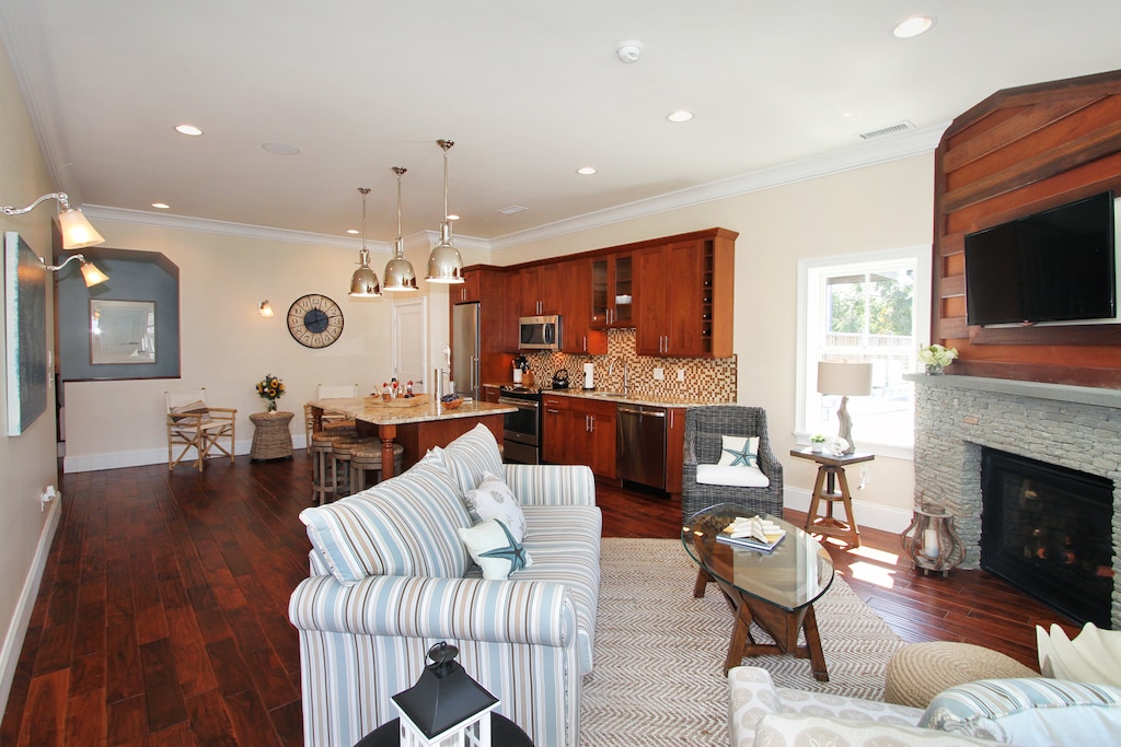 This Loft features two levels of entertainment space and four different balconies that offer everything from quiet relaxation to sweeping views of Narragansett Bay and bustling Thames Street below. On the first level is an open floor plan that unites the gourmet kitchen and living room with queen size sofa bed accented by a cozy gas fireplace. The kitchen is accented by granite counters and stainless steel appliances, including a Kegerator. Each guestroom has a king size bed and en-suite bathroom. The master suite on the second level features sitting area with queen size sofa bed and a spiral staircase leading up to the Loft’s highest balcony. This property also features a driveway for off street parking.