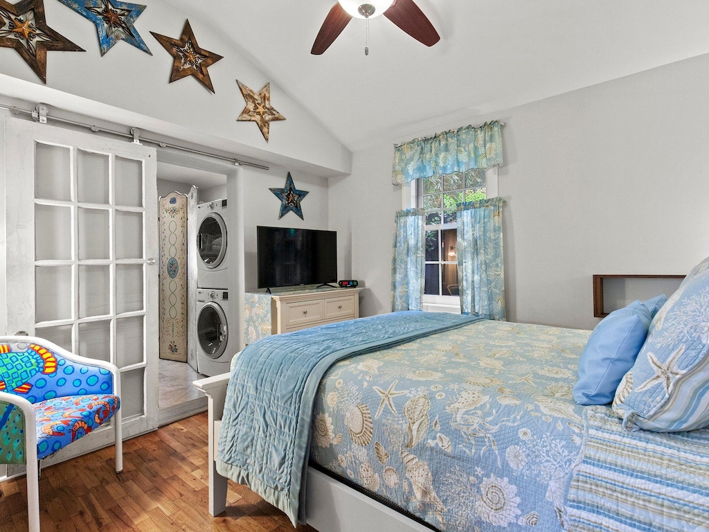 Newly furnished from top to bottom in 2017, you’ll savor the serenity of the living room with its stylish, comfortable chairs, sleeper couch, Smart TV, local art, and heritage tables made of reclaimed wood. Twin beds in the guest room and a queen bed in the master offer brand new pillowtop comfort. Beautiful wood floors gleam throughout the home, highlighted by sunlight streaming through three walls of historic windows in the living room. Vaulted ceilings help the 820-square foot gem “live large.”