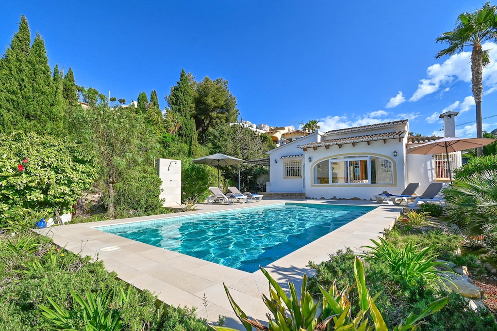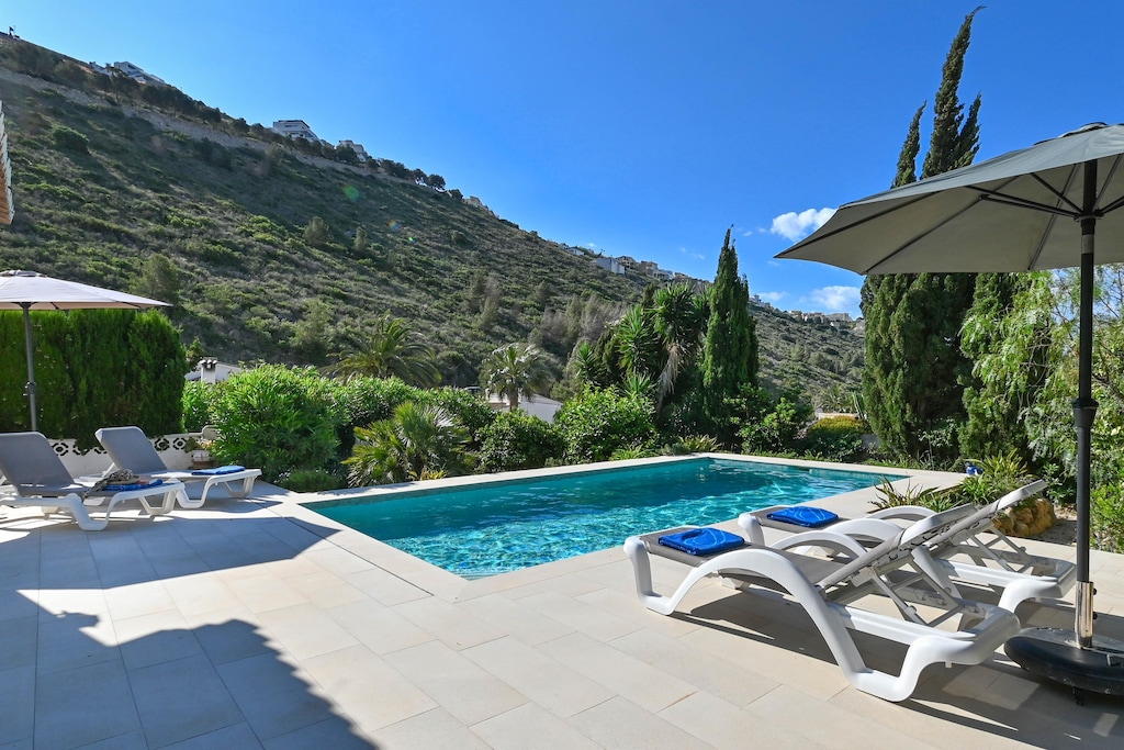 Beautiful and cheerful villa with private pool in Benitachell, on the Costa Blanca, Spain for 6 persons. The house is situated in a hilly and residential beach area, at 4 km from Cala Moraig beach and at 4 km from Moraira. The house has 3 bedrooms and 2 bathrooms. The accommodation offers a garden with trees and a beautiful pool. The vicinity of the beach, places to shop, sports activities, places to go out, sights and culture makes this a fine villa to spend your holidays in Spain with family or friends.