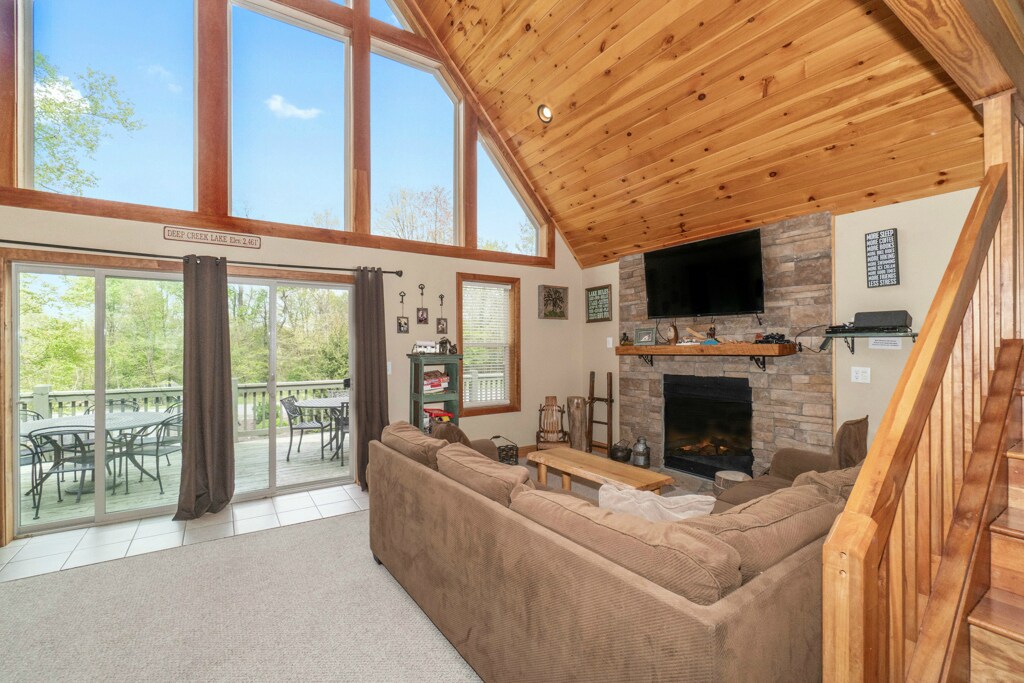 Are you Looking for a Mountain Chalet Very Close to Everything at Deep Creek Lake? You have found it in this stunning 3 level, 5 bedroom, 3 full bath home with a hot tub, two fireplaces, and a wrap around deck located in a quiet community! Inside this home you will find an airy great room with a comfortable seating area around the fireplace, a huge wall of windows, and a vaulted ceiling. The kitchen will delight any chef and has a breakfast bar beside the lovely dining area with plenty of seating for everyone. The lower level opens with a charming recreation room with a pool table for everyone to enjoy. To make your vacation special, this home offers an in-home laundry center, central air conditioning, and unlimited Netflix! The wonderful amenities continue outside with a large wrap around deck on the main level with a gas grill and a lower level patio with a hot tub. Enjoy the cool evenings listening to the sounds of nature and a crackling fire while telling stores and making s’mores.