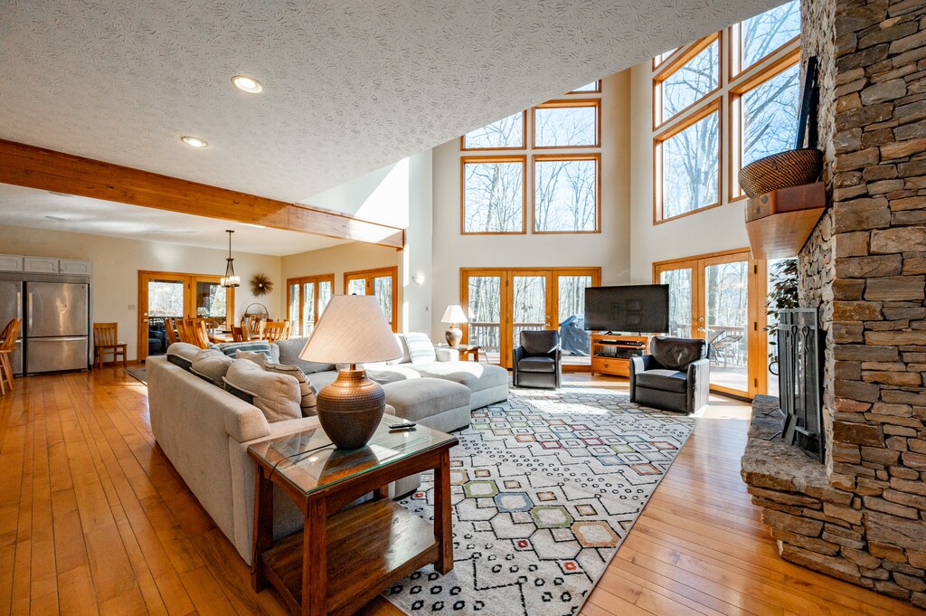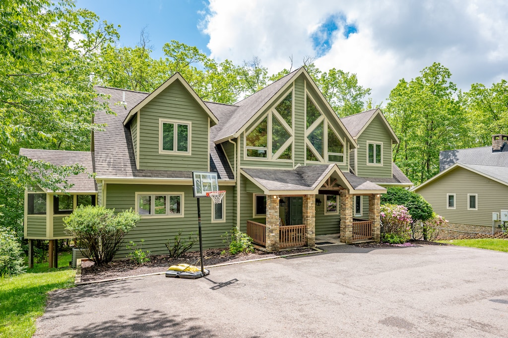 A Signature Collection home! Waterfront Chateau, a Neighborhood Sun solar powered home, is the ultimate rendezvous destination for a getaway among family and friends. Located on a dead end street just 4 miles from the four-season Wisp Resort, the setting is tranquil and serene- and a world away from the hustle and bustle of the city. Enjoy cool mountain air and warm summer nights from the screened-in porch overlooking the tranquil woods around you. Here, tall timbers and lush green woodlands are peppered with giant boulders for the ultimate outdoor experience. Custom designed, this beautiful 7-bedroom chateau boasts a modern gourmet kitchen and 5 master suites- 4 of which offer a gas fireplace and a private bath with an oversized jetted tub. Gather around the fire pit in the evenings for story-telling and s’mores or relax in the bubbles of the hot tub. Privacy and elegance converge at Waterfront Chateau! Book your stay today!