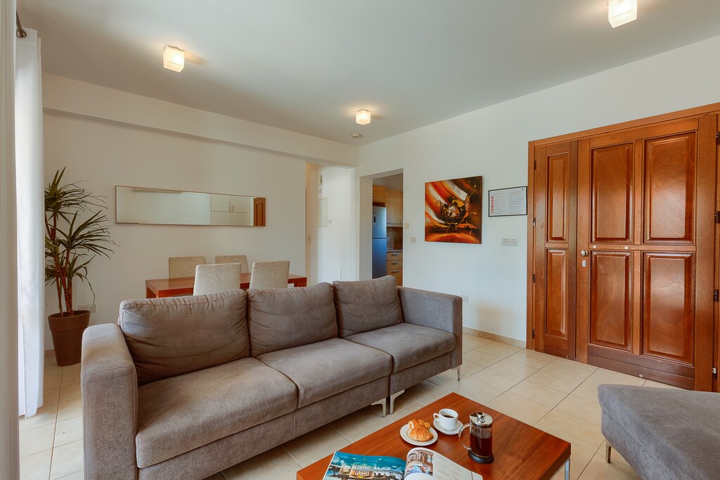 Additionally, the Apartment boasts a patio equipped with sun loungers and an umbrella. Situated in the grassed area and overlooking Theseus Village swimming pool, as well as the children’s swimming pool – this is an ideal place for those who wish to relax, whilst watching their children!