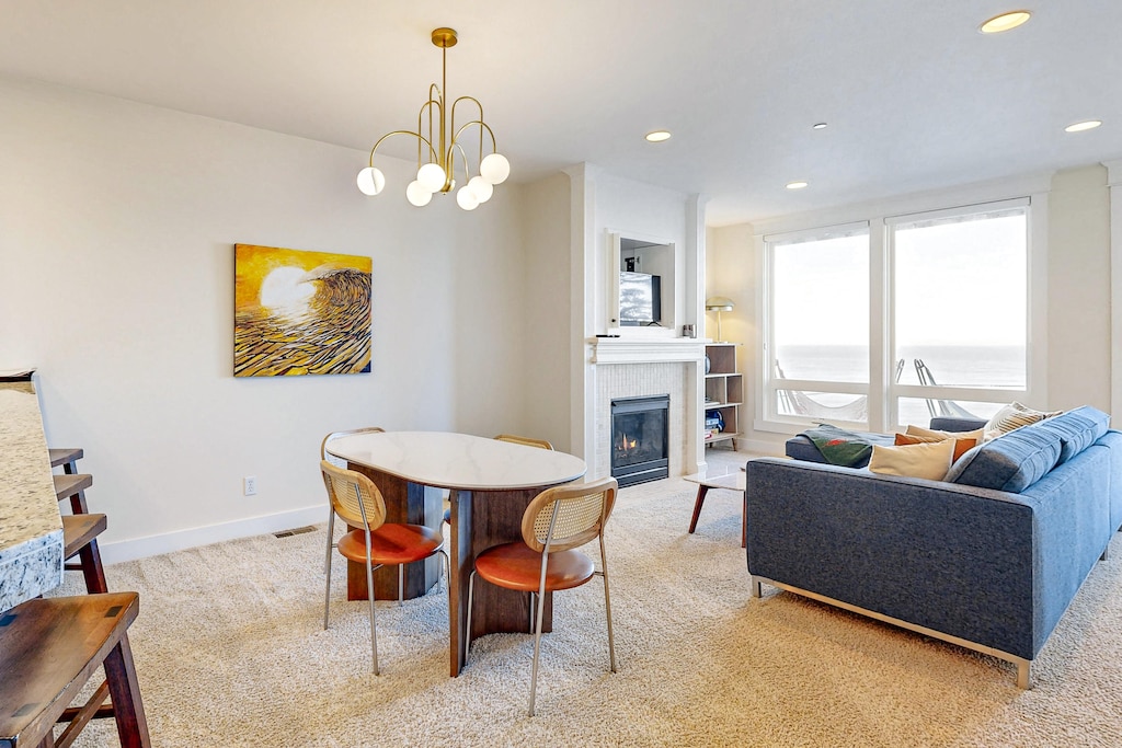Whaler’s Point, located in a very prestigious gated community a short distance south of central Seaside, is the perfect romantic getaway. Get a babysitter and come to this elegant home with a 180-degree view from Tillamook Head to Astoria. Treat your loved ones to a special meal prepared in the kitchen and served with candles at the dining room table or in front of the fire. The master bedroom has a king bed, a bath with a jetted tub, and marble and granite everywhere. The views are to die for! There is a second bedroom with a queen bed and bath looking out onto a private garden. It’s situated on a cliff above a whitewater cove (the cliff is the reason we recommend against children staying here). You could see a whale or an eagle from your vantage point. If you want to impress someone you love, this is the place.